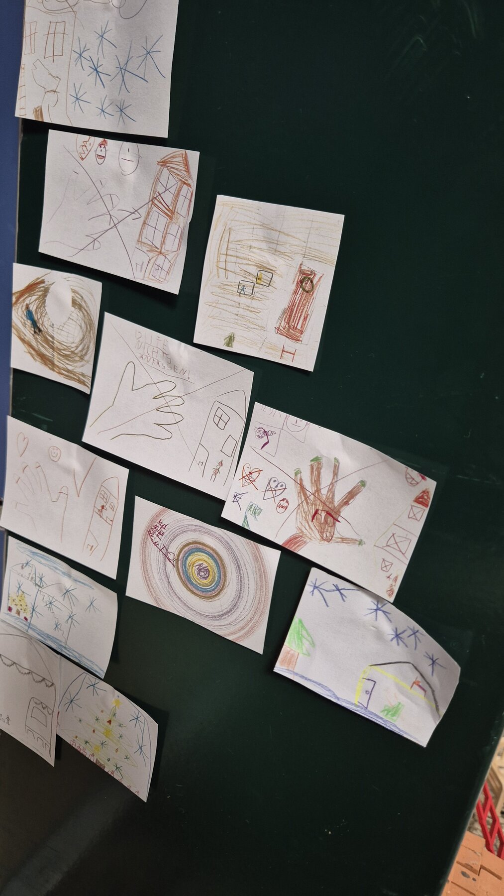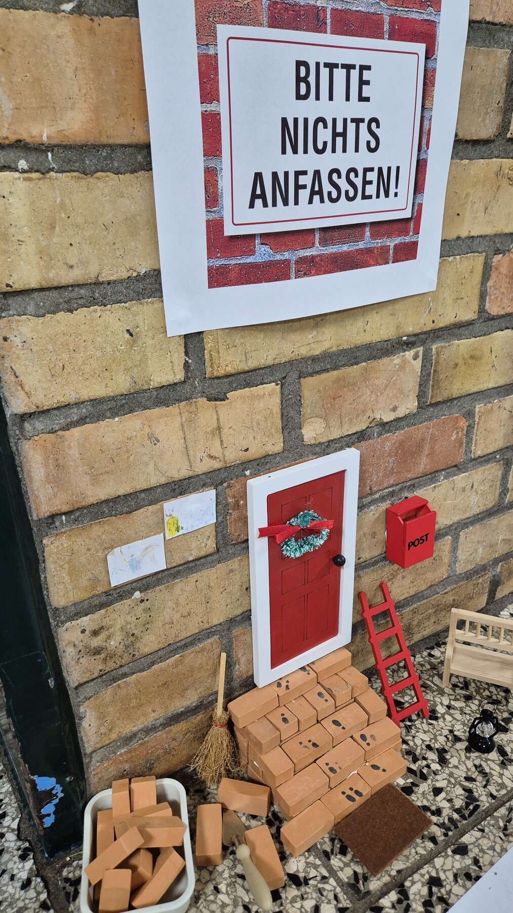 Auch bei uns in der Schule ist ein Wichtel eingezogen und treibt Schabernack in der Nacht. Er zaubert zum Beispiel die gemalten Bilder der Kinder ganz klein und hängt sie neben seiner Tür auf.
